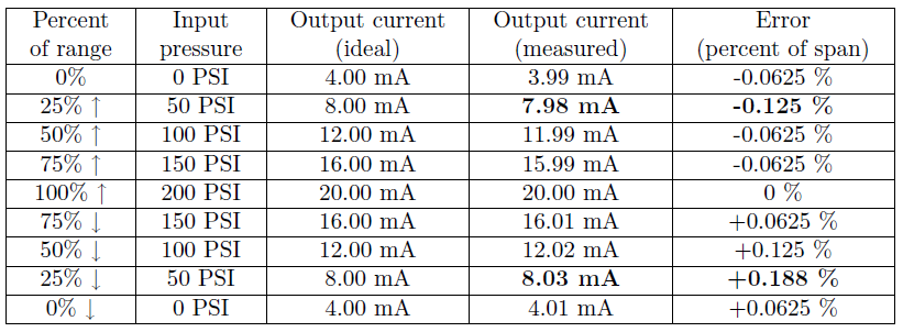 It is not uncommon for calibration tables to show multiple calibration points going up as well as going down, for the purpose of documenting hysteresis and deadband errors. Note the following example, showing a transmitter with a maximum hysteresis of 0.313 % (the o®ending data points are shown in bold-faced type):