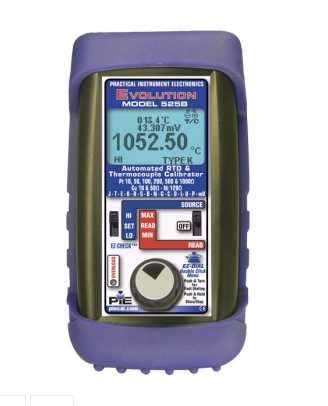 The PIEcal Model 525B Automated RTD & Thermocouple Calibrator is an industrial temperature sensor calibrator that accommodates RTDs (resistance temperature detectors) and thermocouples with its built-in NIST-traceable cold junction sensor. The PIE 525B is also suitable for use in calibration labs since its high accuracy and resolution are achieved by using an extremely stable, low drift circuit design featuring a +/- 0.05degC reference thermistor. In addition to registering actual temperature, the PIE 525B shows the precise resistance value when displaying RTD temperature. It features patented automatic detection of 2, 3 or 4 wire RTD connections and also detects when individual wire connections are open circuit. Inputs are protected up to ±60VDC against possible misconnection.