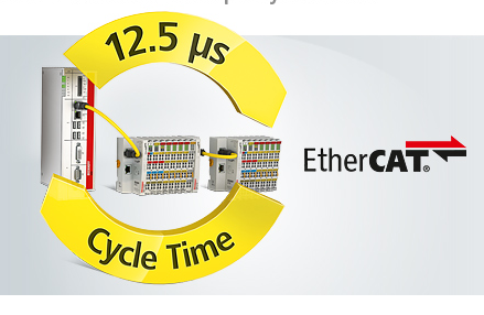 “When we first presented EtherCAT in 2003, the performance of this new fieldbus technology was still miles ahead of the controller capability of the time. With TwinCAT 3 and the current IPC CPUs the gap is closing, although it's still not possible to foresee when we will be able to make the maximum EtherCAT data throughput fully usable for machine controllers”, says Dr. Dirk Janssen, Manager Software Development at Beckhoff and one of the inventors of EtherCAT. “With the 12.5 µs presentation we were showing what the Beckhoff system is capable of together with our EtherCAT Terminals.” Dirk Janssen says that the bus cycle time, while exciting, is actually in itself not decisive: “A fast fieldbus only becomes a fast control system with a capable controller and ultra-fast I/O components. And only with EtherCAT can the highest performance of the fieldbus be implemented continuously through to the I/O signals: All technologies that rely on bus couplers with a separate, local I/O bus suffer here from system-related disadvantages.”