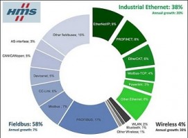 According to HMS, industrial Ethernet is growing faster than previous years and taking more market shares. At a growth rate of 20%, Ethernet now makes up for 38% of the global market compared to 34% last year. EtherNet/IP is the number one Ethernet network with 9% followed by PROFINET (8%). Runners-up are EtherCAT, Modbus-TCP and Ethernet POWERLINK.